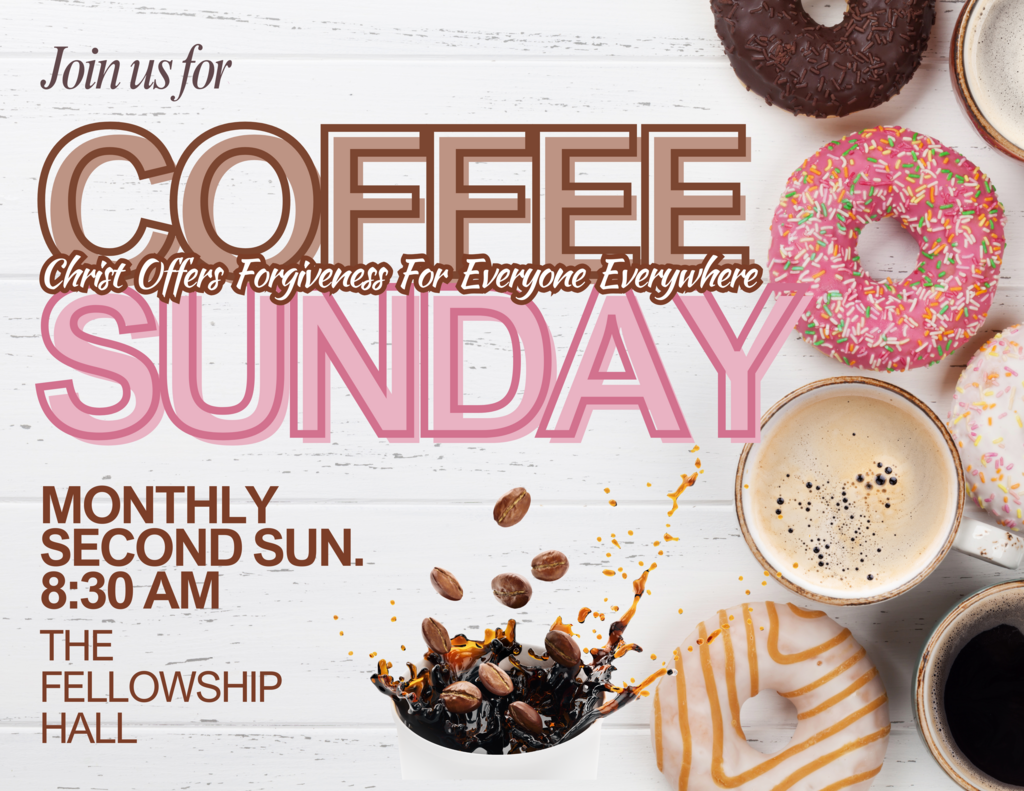 On the second Sunday of each month, we invite you to C.O.F.F.E.E. Sunday at Gracewood; C.O.F.F.E.E. stands for Christ Offers Forgiveness For Everyone Everywhere! It consists of coffee and juices, a variety of donuts, sausage balls, and fruit. We meet in the fellowship hall at 8:30 a.m. for breakfast and fellowship. Sunday, November 9th at 8:30am in our fellowship hall.